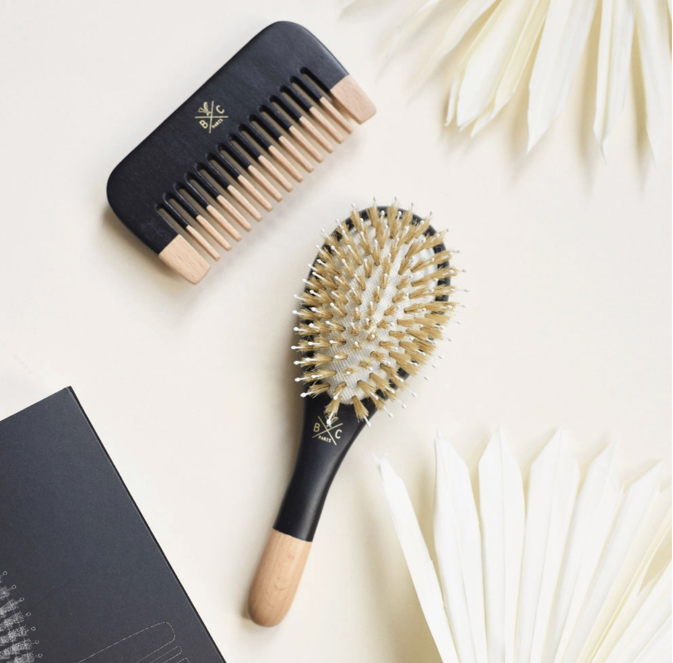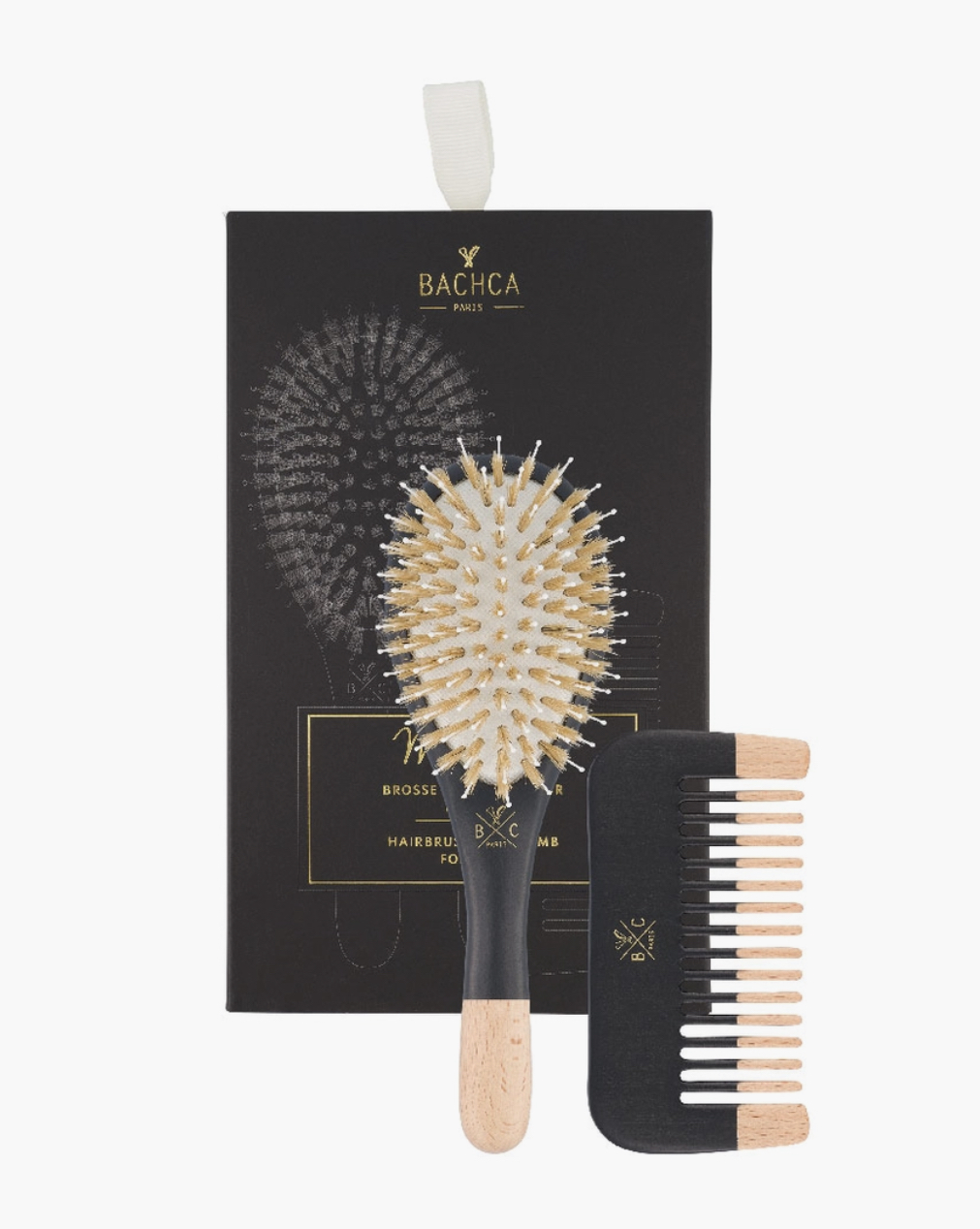 The Bachca Men Kit includes a brush and a comb. These tools, with a refined design and delicately shaped by hand, are made of beech wood and made to last. The combination of nylon pimples and wild boar bristles the brush helps to disentangle gently while smoothing the hair.